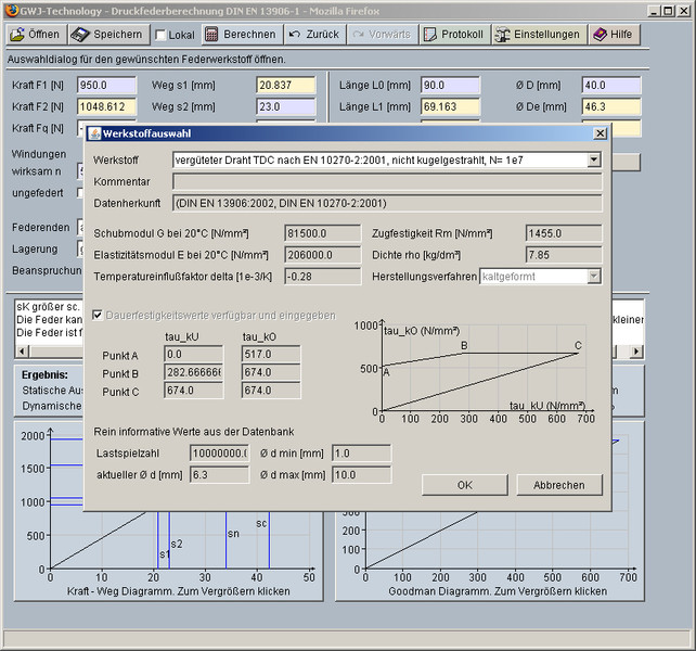 Die wichtigsten Ergebnisse, d.h. die statische und dynamische Ausnutzung der zulässigen Spannung, der Federhub und die Ausnutzung des zulässigen Federweges werden bereits während der Eingabe übersichtlich angezeigt. Zusätzlich erfolgt die Darstellung des Goodman- und des Kraft-Weg-Diagramms. Die Diagramme lassen sich per Mausklick vergrößert darstellen.