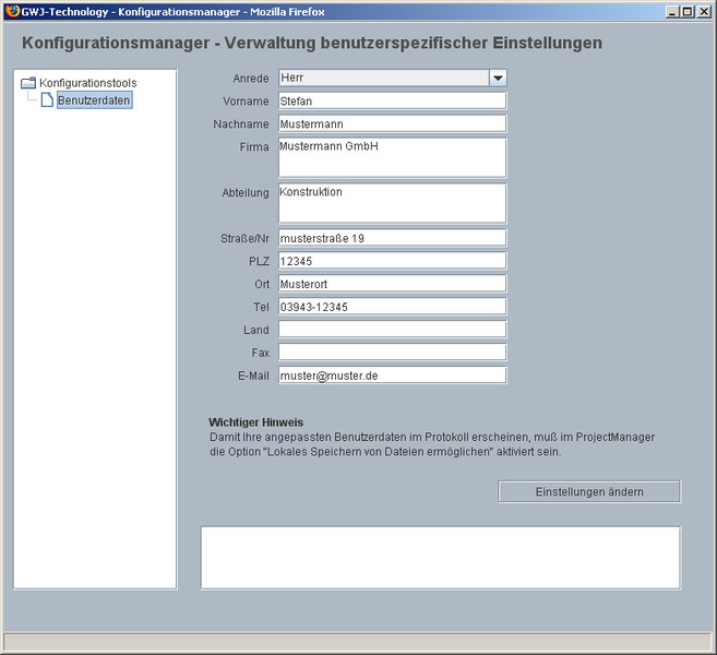 Nutzen mehrere Anwender den eAssistant mit einem einheitlichen Benutzernamen und Passwort, wie dies insbesondere bei mehreren Parallelzugängen in einer Firma möglich ist, so kann der einzelne Anwender mit Hilfe des Konfigurationsmangers seine individuellen Benutzerdaten an seinem Arbeitsplatz selbst konfigurieren. Diese erscheinen dann bei der Erzeugung der Berechnungsprotokolle auch im Protokollkopf. Damit ist für die Berechnungsdokumentation ersichtlich, wer die jeweilige Berechnung durchgeführt hat.
