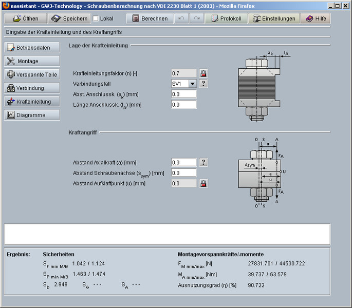 Ähnlich einfach können die Art der verspannten Teile, d.h. die Grundkörpergeometrien, sowie die Krafteinleitung und der Kraftangriff definiert werden. Es werden sowohl zentrische als auch exzentrische Verspannungen unterstützt. Dabei wird der Anwender durch entsprechende Hilfsgrafiken optimal unterstützt. Für die Wahl des Schraubennenndurchmessers ist darüber hinaus eine Vorschlagsfunktion verfügbar.