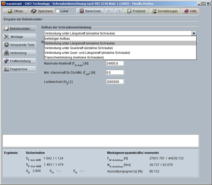 Es können Einzelschrauben unter Längs- und Querkraft (nach VDI 2230-1) sowie Flanschverbindungen (nach VDI 2230-2) als Berechnungskonfiguration ausgewählt werden. Zusätzlich ist ein beliebiger Aufbau mit individueller Definition der Belastungen möglich.