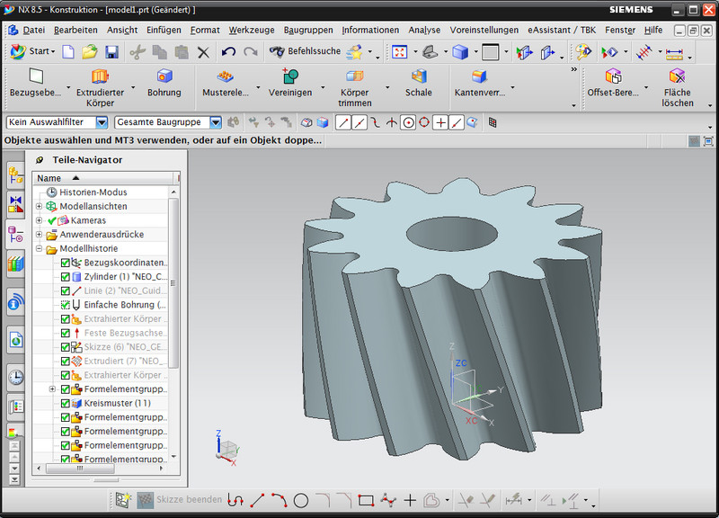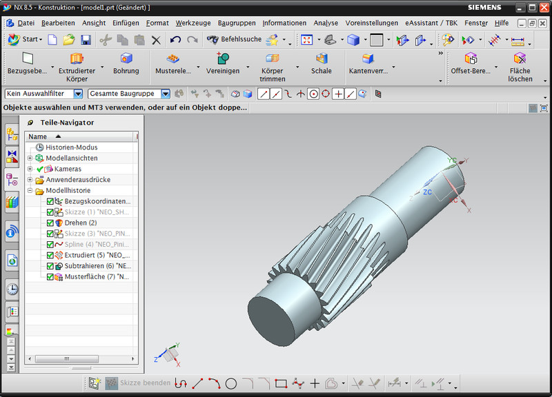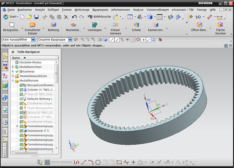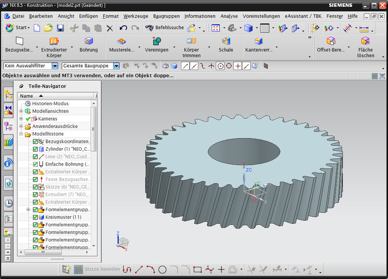 Based on the eAssistant calculation in the module "Cylindrical gear pair", external and internal spur and helical gears can be created automatically as a feature-based 3D part in NX. Addendum chamfer, profile shift, tolerances and shaft bore will be considered in the calculation and modelling. The gears include the accurate tooth form.