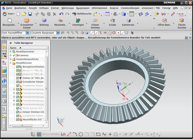 Based on the calculation, straight, helical and spiral bevel gears can be generated as a native 3D part in NX.