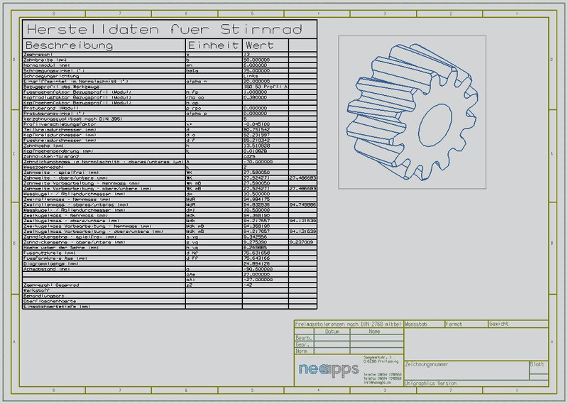 With just one click, the design table with all manufacturing details of cylindrical gears, bevel gears and involute splines can be placed on the manufacturing drawing. The appearance and size of that table is individually configurable. There is no need to manually add all design table parameters to the drawing.