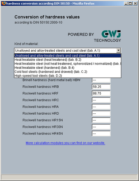 Using this module, it is possible to convert different hardness values into each other. The hardness values also can be determined by the input of the tensile strength. Different kind of materials can be selected for the calculation: