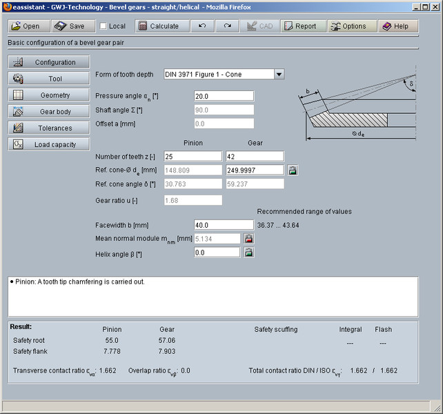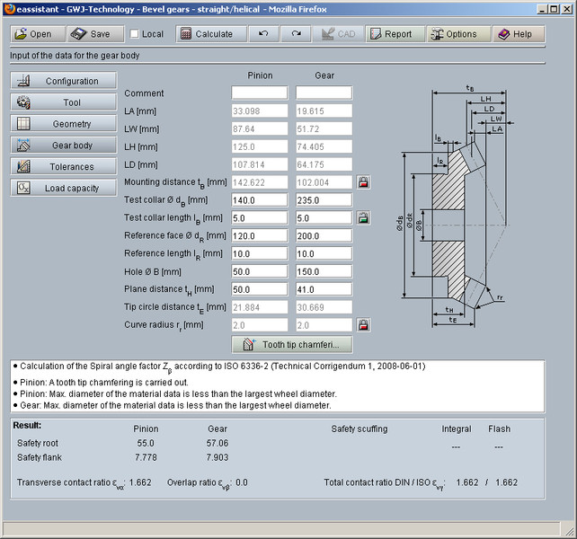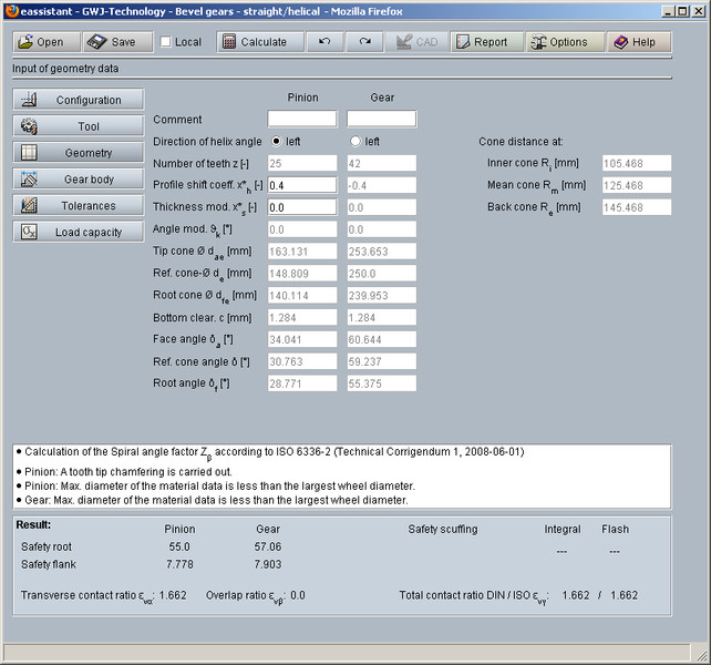 In addition to the geometry calculation, a calculation of the load capacity according to ISO 10300 Method B1 is possible. The user can calculate the safeties for fatigue or limited life strength and static strength (tooth root, flank / pitting, scuffing). Material and lubricant databases support the user. Additionally, the mode of operation is considered (swelling, alternating and oscillating).