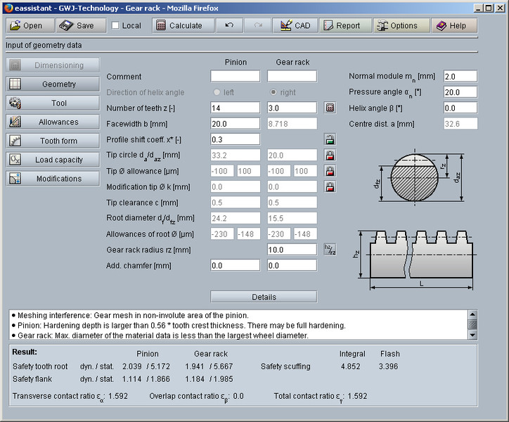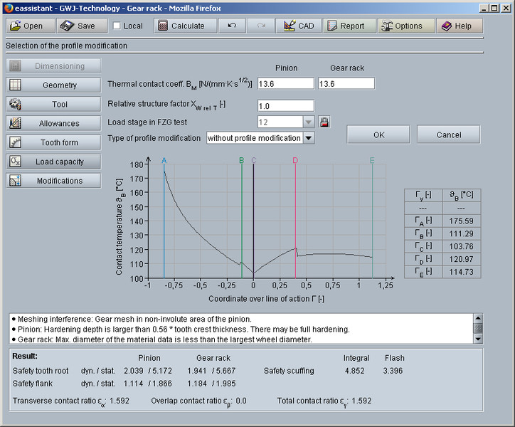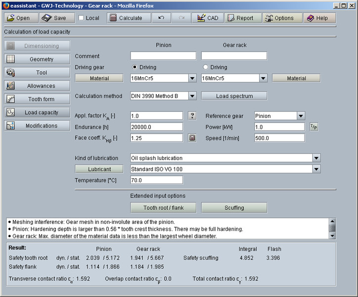 In addition to the geometry calculation, the load capacity calculation according to DIN 3990 Method B is also available. Herewith the safeties for fatigue or limited life strength and static strength can be calculated. The calculation of surface durability (pitting), tooth bending strength and scuffing according the flash and integral temperature method is carried out. A diagram for the contact temperature over the length of the line of action is also available.
