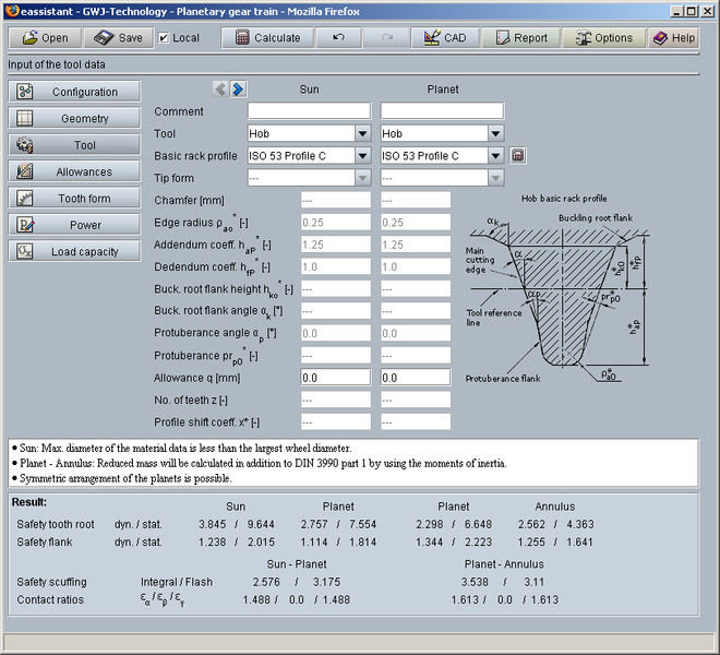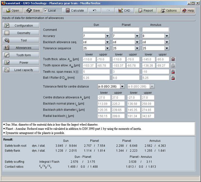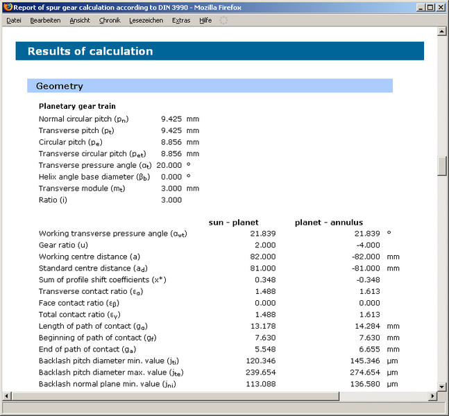 In addition to the geometry calculation, the torques, speeds, relative speed of the planet gear, power, pitch power, coupling power are determined as well. Tangential force of the planet carrier as well as centrifugal force of the planet are calculated.