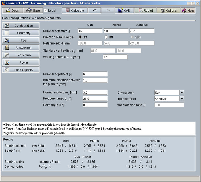 This gear calculation module allows a fast and easy calculation of planetary gear trains with any number of planet gears. There are different drive configurations possible. The configuration part of the module provides a fast solution regarding special requirements. By choosing the number of teeth and a selected drive configuration, the transmission ratio is immediately determined. Furthermore, the standard centre distances of cylindrical gear pairs sun/planet and planet/annulus are displayed. The working centre distance can be defined. The symmetric arrangement of planet gears and the defined minimum distance are checked. If a symmetric arrangement of planet gears is not possible, a suggestion for an unsymmetric arrangement will be displayed.