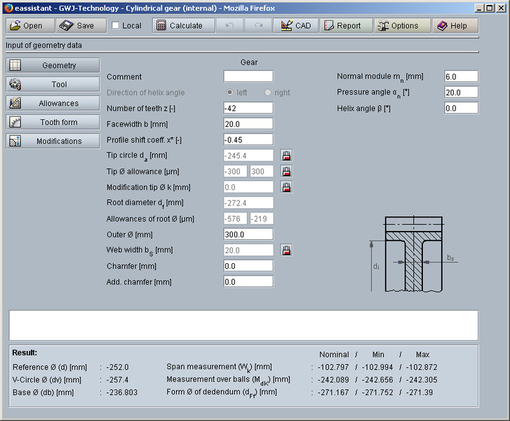 This gear calculation module allows a simple calculation of single external and internal cylindrical gears according to DIN 3960, DIN 3961, DIN 3964, DIN 3967, DIN 3977 and DIN 868. External spur and helical gears as well internal gearings are possible to calculate. Profile shift, addendum chamfer and allowances will be taken into consideration. Gear quality and tooth thickness tolerances can be comfortably selected from listboxes.