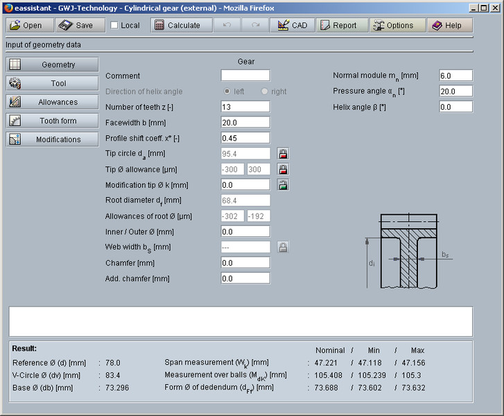 Different standardised tool basic rack profiles according to ISO 53, DIN 867 and DIN 3972 can be selected or defined individually for the calculation. Protuberance tools with a shifted profile reference line are also supported. A machining allowance per flank can also be defined. Full-depth teeth and stub tooth gears can be calculated as well. Furthermore, the test dimensions for the gearing are determined. For that, the required number of teeth for the span measurement as well as the ball or pin diameter will be determined automatically. Optionally, the values can be defined by the user. In addition, a backward calculation of the tooth thickness allowances from the test dimensions is also possible.