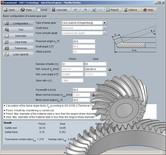 This gear calculation module allows a fast and easy calculation of Klingelnberg´s Zyklo-Palloid® spiral bevel gears according to ISO 23509 and KN 3028. A recommended range of values for facewidth, mean normal module and mean spiral angle is shown next to the input fields. Standard basic rack profiles according to ISO 53, DIN 867 and DIN 3972 are available for the calculation or can be defined individually. A listbox displays available Klingelnberg machines that may be selected for the manufacturing process by the user. The user can choose recommended machine types and standard cutter radii. Individual machine data, such as cutter radius, number of blade groups or cutter module, can be defined manually. Cutter heads according to ISO 23509 are available.