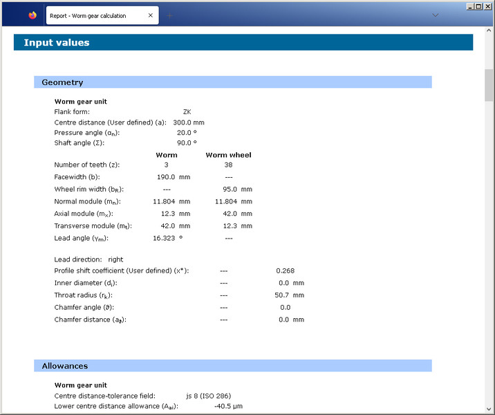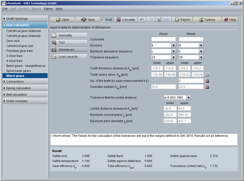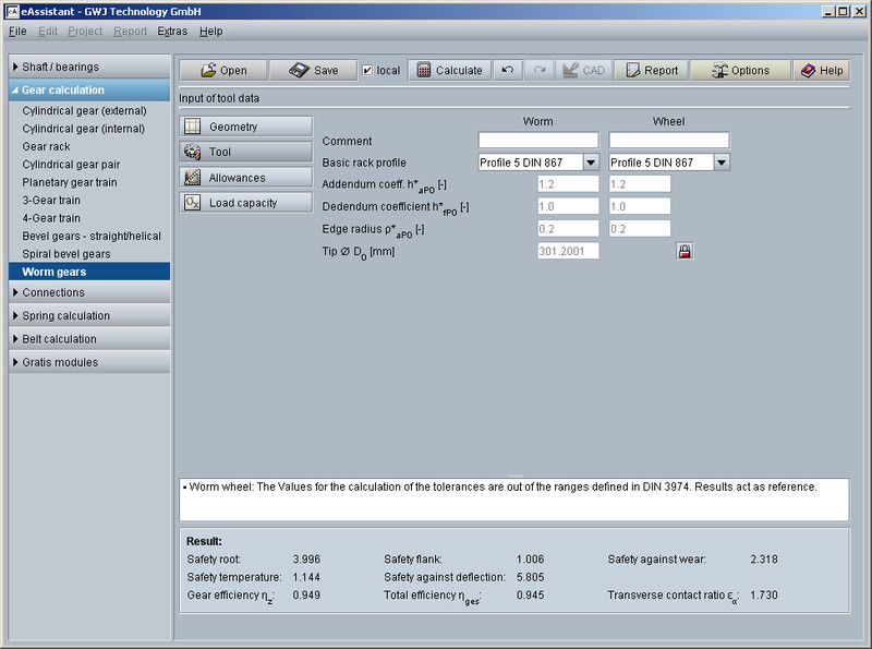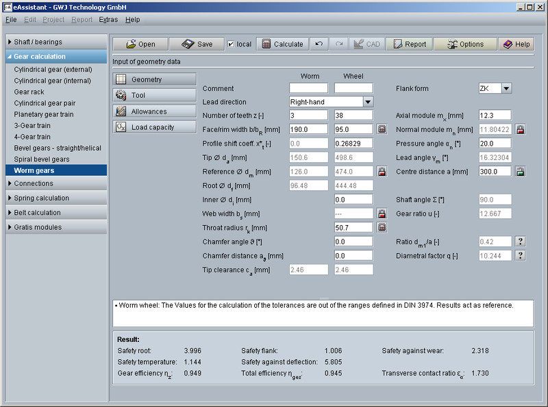 This module allows an easy and fast calculation of the geometry and load capacity of cylindrical worm gear pairs with a globoid worm wheel and an axis angle of 90°. Different flank shapes such as ZA, ZK, ZN, ZI/ZE as well as ZC can be selected for the calculation. For the geometry calculation, for example, axial or normal module, number of teeth, pressure angle, profile shift, lead angle can be entered. The axial module can be entered for the geometry calculation, but it is also possible to perform the calculation with the normal module. The calculation is possible with any module, even with several decimal places.