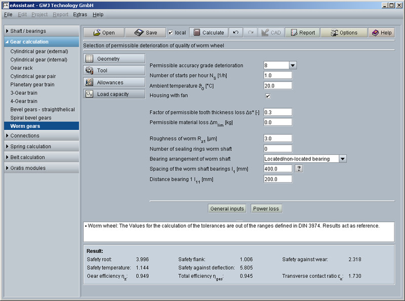 In addition to the geometry calculation, the load capacity calculation is also available, either according to DIN 3996 Method B, ISO/TR 14521 Method B or Niemann. The safeties for the tooth root and tooth flank (tooth break and pitting) are calculated and the temperature safety and safety against deflection and wear are also determined.