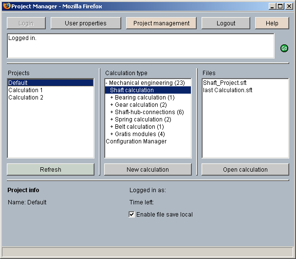 The eAssistant is integrated into an online working environment. The project manager is the central point and is opened after a successful login. It contains a project management as well as a tree structure to start the several calculation modules. The project manager displays time-based information, such as remaining time for time limit accounts. The project manager includes also the user administration where the user can enter and change personal data (name, company or password, etc.).