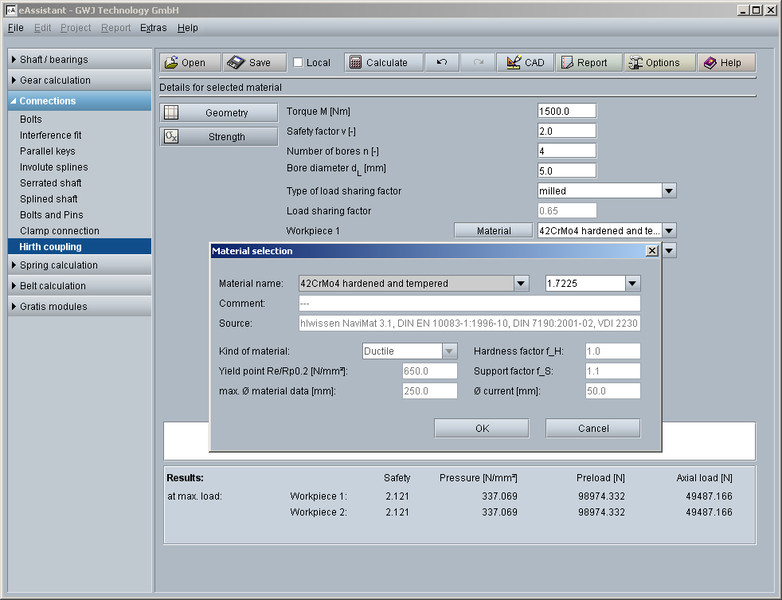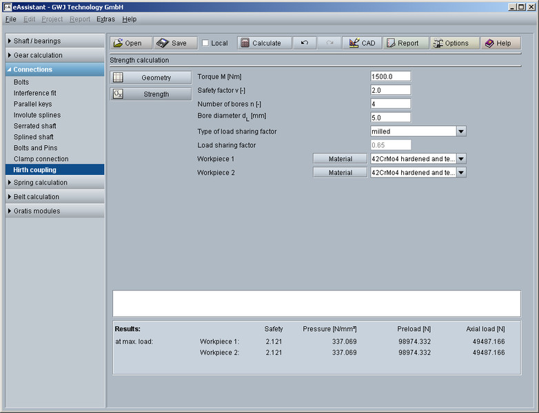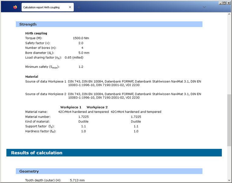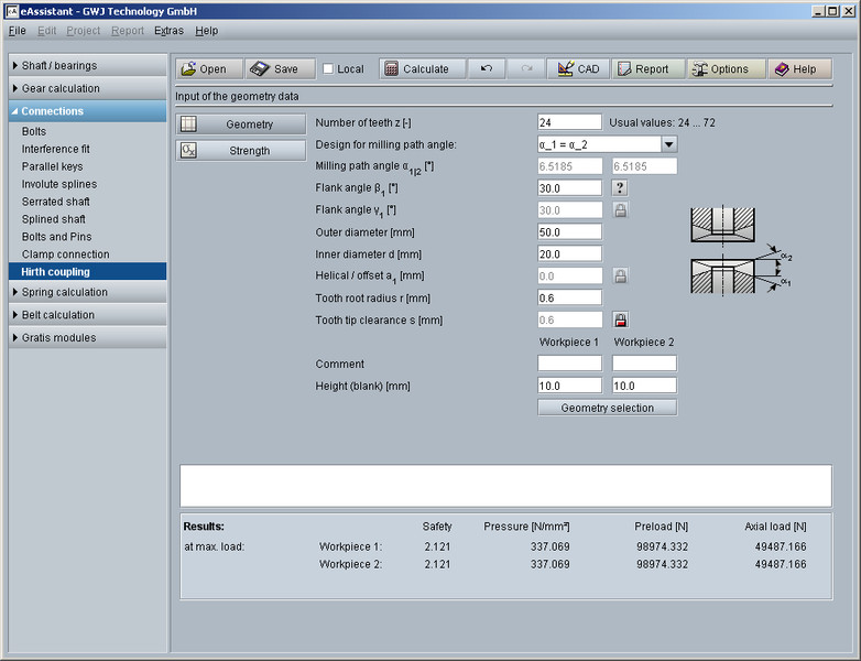 The calculation module can be used to determine the geometry and strength of Hirth couplings. By entering the number of teeth, outer and inner diameter, flank angle and tooth root radius, the geometry is automatically calculated. Various special cases of the connection are also supported.