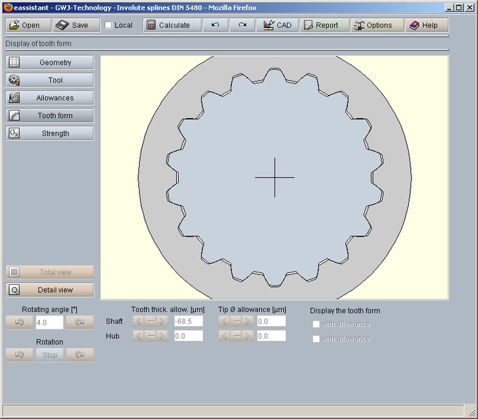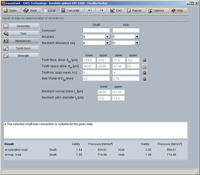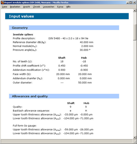 In order to determine the tolerances, the gear accuracy and backlash allowance sequence according to DIN 5480, DIN 5482, ANSI B92.2 and ANSI B92.1 can be selected from listboxes. This will determine the permissible deviations and tooth thickness allowances. The calculation of the tooth thickness allowances can be done based on measured values or given test dimensions. Test dimensions, backlash normal plane and backlash pitch diameter are calculated as well. For the test dimensions, the required number of the teeth for span measurement and the diameter of ball or pin will be determined automatically by the program or can be entered by the user.