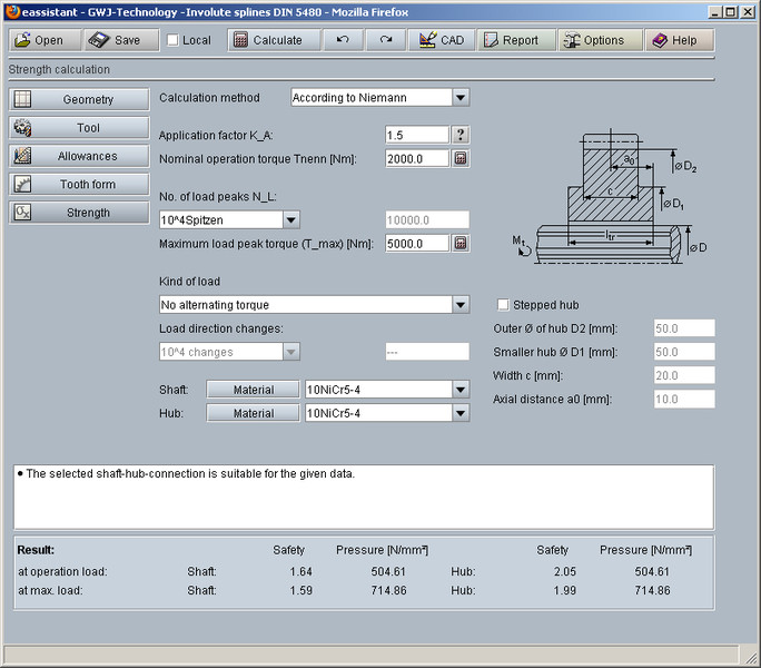 The strength calculation is based on Niemann´s „Maschinenelemente“ Vol. 1, Edition 2001. The permissible surface pressures are determined from material properties, so it is possible to use special materials. Materials can be selected from the data base. For a different load input and output, the load factor according to DIN 6892 will be calculated based on the defined geometry. In addition, load peaks and alternating torque can be specified for the calculation. Dimensioning functions for the operation nominal torque, the maximum load peak torque and the supporting length help the user. The calculation results for the surface pressure and safeties for operation load and maximum load for shaft and hub are determined and displayed immediately during the input of values.