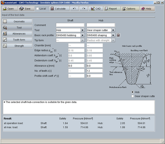 The following tool types are available: hob, gear shaper cutter and constructed involute. Basic rack tooth profiles can be selected according to DIN 5480 for broaching, hobbing, shaping, cold rolling and diameter centering. Tool standard rack tooth profiles for the other standards are also available, e.g., for ISO 4156 30° flat root or 30° fillet root. All parameters for the basic rack tooth profile can be defined individually or determined automatically.