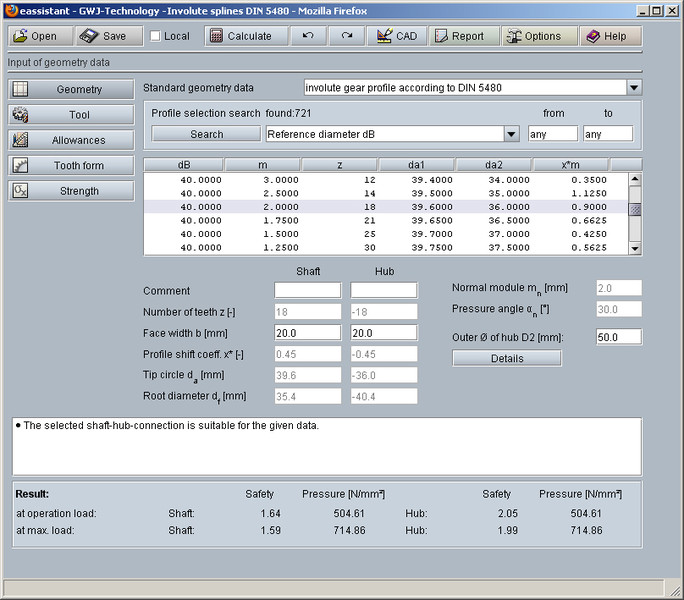 The module allows a fast and easy calculation of the geometry and strength of involute splines according to DIN 5480 (03/2006), DIN 5482 (03/1973), ISO 4156 (10/2005), ANSI B92.2M-1980 (R1989) and ANSI B92.1-1996. The geometry can be selected conveniently from a data base. The profile search function can help the user to quickly identify a profile. An own input of involute spline geometry is also possible.
