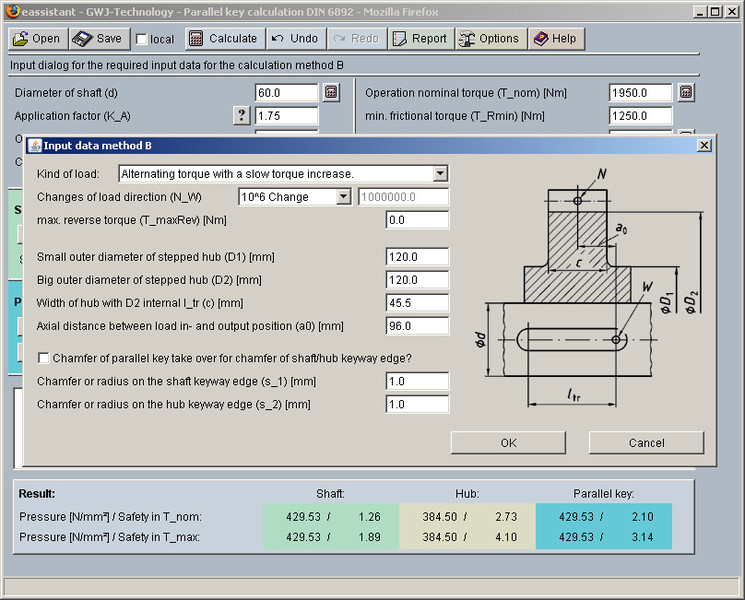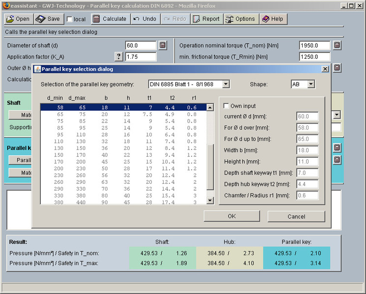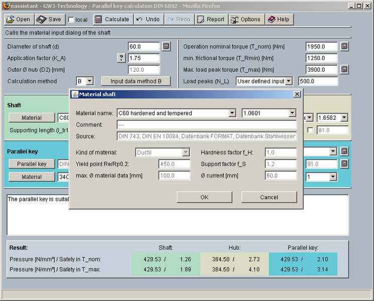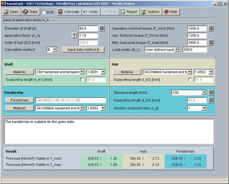 The calculation of parallel key connections is based on DIN 6892. Both calculation methods B and C are completely realised. The allowed pressures will be calculated on the base of the material properties. So, it is possible to use special materials. Furthermore, in the case of a combination of interference fit and parallel key connection, an additional frictional torque can be taken into consideration.