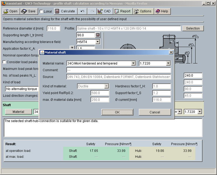 The allowed pressures will be calculated on the base of the material properties. So, it is possible to use special metal materials. Available materials can be selected very easily from the integrated material database. For different load in and output, the load factor according to DIN 6892 will be calculated on the base of the given geometry. Additional load peaks and alternating torque are definable for the calculation.