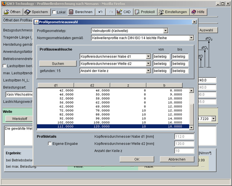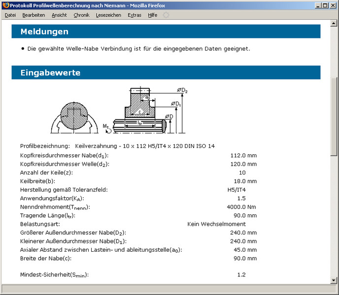 El cálculo de resistencia para los acoplamientos de ejes acanalados según Niemann “Elementos de máquinas” Tomo 1, Edición 2001. se realizará según las normas DIN ISO 14 (para cargas ligeras y medianas), DIN 5464, DIN 5471 y DIN 5472. Las dimensiones pueden ser seleccionadas directamente desde nuestra base de datos o identificadas por medio de la búsqueda de perfil. Adicionalmente se pueden ingresar perfiles que no estén estipulados en la norma.