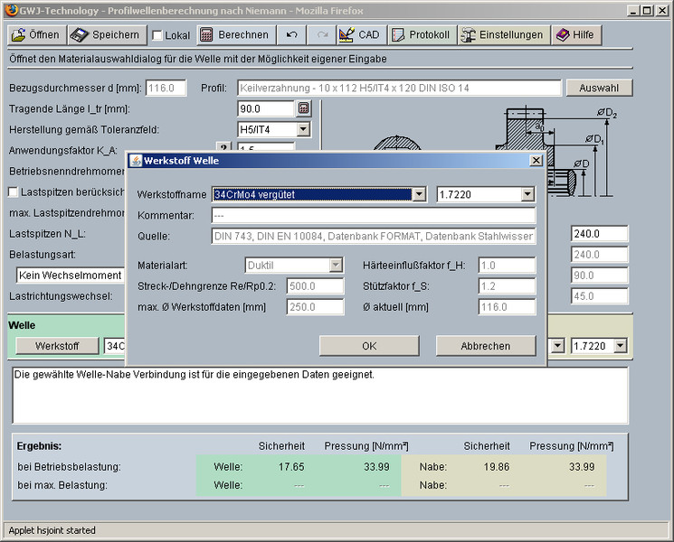 Los materiales podrán seleccionarse desde nuestra base de datos integrada, existiendo la posibilidad de trabajar con materiales especiales. A partir de las características de estos se determinarán las compresiones admitidas. En base a las especificaciones geométricas y para las distintas cargas de salida y entrada, se calculará el factor de distribución de carga según la norma DIN 6892. Además se pueden indicar el número de las cargas máximas y el tipo de torque cambiante.