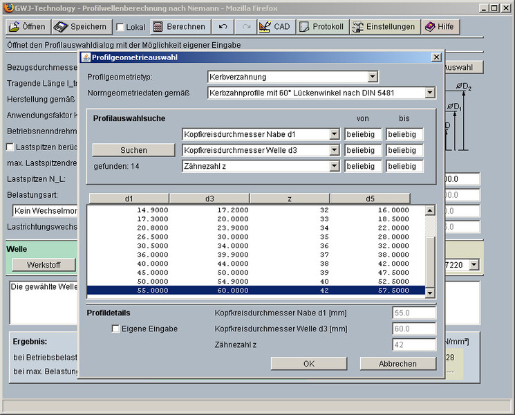 Con el módulo “Dentado por Entalladura” se puede realizar el cálculo de resistencia de acoplamientos árbol-cubo con perfiles dentados por entalladura según la norma DIN 5481. El cálculo se realiza según Niemann “Elementos de Máquinas” tomo1, edición 2001. Las Dimisiones se pueden seleccionar cómodamente desde la base de datos o identificar rápidamente por medio de la búsqueda de perfil. También se pueden ingresar perfiles que difieran de las normas.