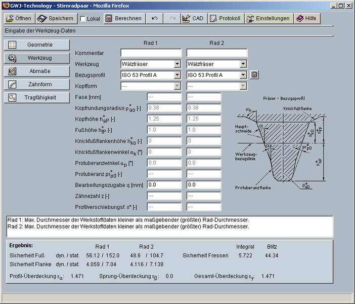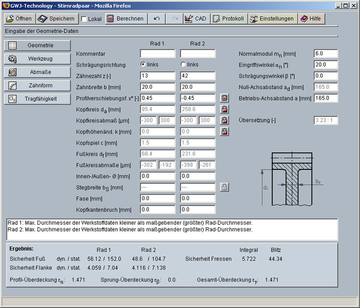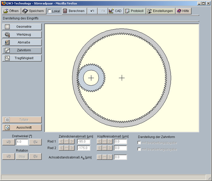 Este módulo le facilita el cálculo rápido de la geometría de pares de ruedas según las normas DIN 3960, DIN 3961, DIN 3964, DIN 3967, DIN 3977 y DIN 868. Se considerará en el cálculo el desplazamiento de perfil y las tolerancias. Se podrán escoger de las listas correspondientes, las tolerancias de grosor de dentado, la distancia entre ejes y los perfiles de referencia. Para el desplazamiento de perfil están a disposición del usuario las funciones de dimensionado para un deslizamiento específico equiparado. A su vez, se determinarán las medidas de prueba para el dentado y se calculará automáticamente la cantidad necesaria de dientes y el diámetro para el calibrado. Opcionalmente, el usuario podrá indicar estos valores.