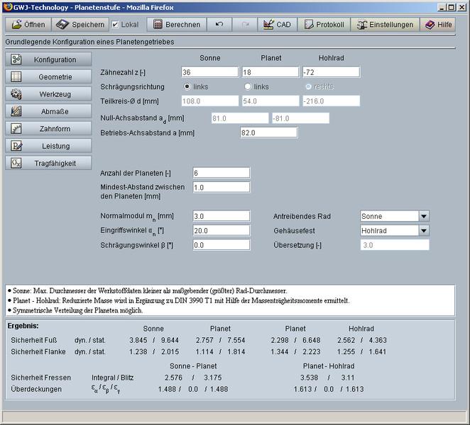 Junto al cálculo geométrico también se determinarán torsiones, revoluciones e incluso de revoluciones relativas de los planetas como también rendimiento evolvente el rendimiento de acoplamiento, asi como la fuerza periférica del contrete y la fuerza centrifuga planetaría.
