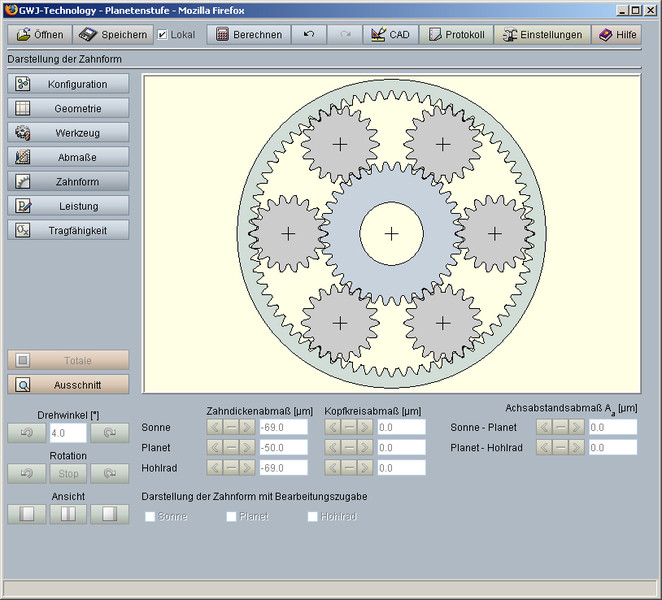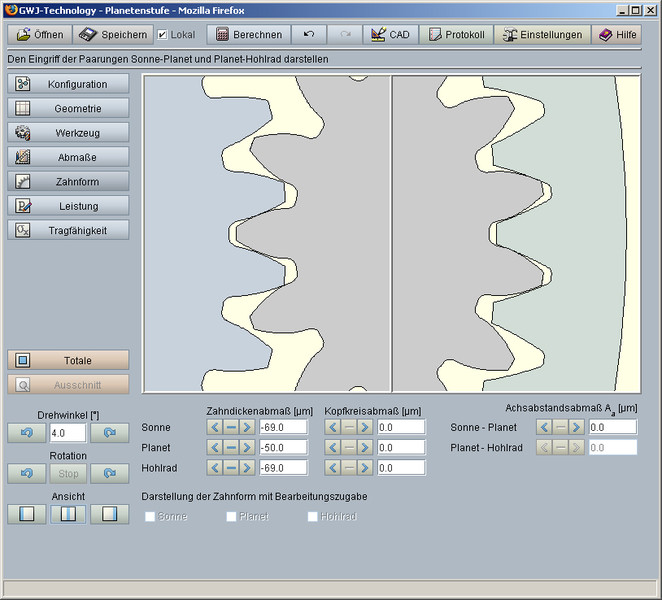 Un componente especial del módulo es la representación exacta de la forma calculada del dentado con animación/simulación paralela del engranaje de sol/ planeta y planeta / rueda hueca. Para este propósito se pueden seleccionar dimensiones pequeñas medianas o grandes para el grosor del dentado y para la distancia del eje. Adicionalmente, el usuario recibe una advertencia en caso de posibles fallas en el engranaje.