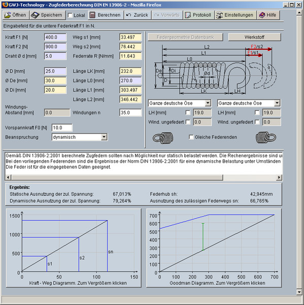 Los resultados más importantes, es decir, el aprovechamiento estático y dinámico de la tensión admitida, la trayectoria de suspensión y el aprovechamiento de la trayectoria total del muelle se mostrarán claramente durante el ingreso de los datos. Adicionalmente se efectuará la representación de los diagramas de Goodman y de fuerza-trayectoria. Para maximizar el diagrama haga un clic sobre el diagrama correspondiente.