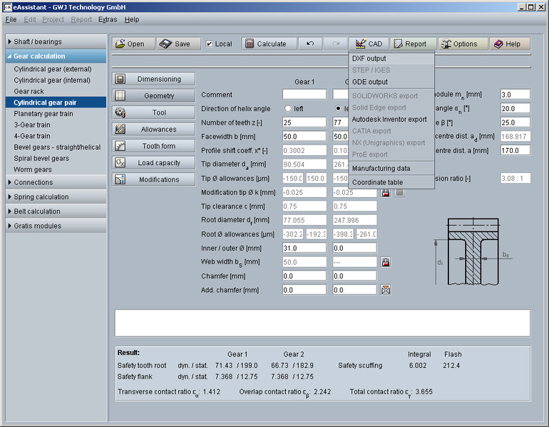 For involute tooth forms, the output in 2D DXF format is possible with various setting options. The DXF output is available for single cylindrical gear (external/internal), cylindrical gear pairs, planetary gear trains, three- and four-gear train systems, gear racks, involute splines.