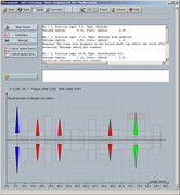 Le calcul de capacité de charge fournit une vérification d'endurance et de statistique selon la norme DIN 743. Les sécurités calculées pour les nombreuses coupes transversales seront affichées dans un graphique de résultats en trois couleurs différentes selon leur efficacité. Les sections en rouge n'ont pas atteint la sécurité minimale. La couleur verte est pour les sections avec des sécurités de la sécurité minimale défini au triple. Les sections en bleu ont une sécurité supérieure au triple de la sécurité minimale. Les valeurs exactes des sécurités sont présentées dans une fenêtre de texte ou peuvent être consulté avec la souris dans le graphique.