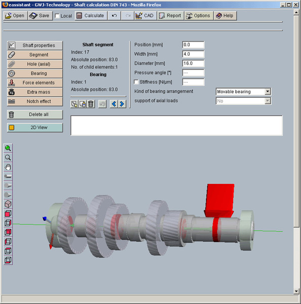 En plus de l'entrée directe des forces et des couples, des éléments de force intelligents peuvent aussi être utilisés, tels que les engrenages, les masses supplémentaires ou l'embrayage/le moteur. Pour le calcul de capacité de charge selon la norme DIN 743, tous les types des effets de concentration de tension de la norme peuvent être définis. En outre, l'effet de concentration de tension „arbre lisse“ est introduit dans le calcul afin, par exemple, d'effectuer une validation du calcul de capacité de charge dans une pièce d'arbre lisse très chargée. En plus des entrées de géométrie en deux dimensions, une vue en 3D est disponible.