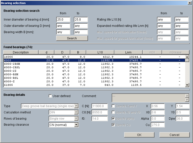 Dans la base de données, près de 20.000 roulements des fabricants NSK, SKF, SNR, et Koyo sont disponibles. Une fois que l'utilisateur a sélectionné le constructeur, le type de roulement désiré et a fixé ses charges de roulement, il peut sélectionner dans la liste le roulement désiré ou l'identifié rapidement et facilement en utilisant la fonction de recherche de palier. Pour la recherche d'un roulement, les paramètres suivants peuvent être utilisés :