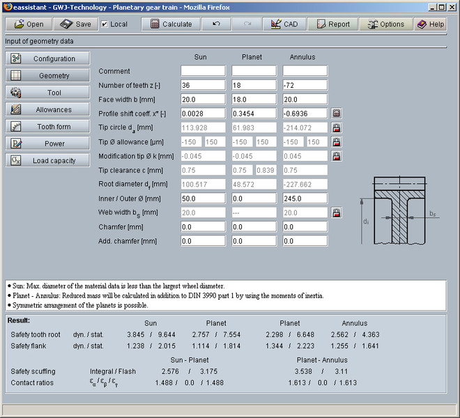 En plus du calcul de géométrie, les moments du couple, les vitesses y compris la vitesse relative des planétaires, ainsi que la puissance, la puissance primitive de fonctionnement et la puissance du couplage sont également détérminés. La force tangentielle et centrifuge des planétaires ainsi que le calcul de la possibilité de charge selon la norme DIN 3990 sont intégrées au module. Les sécurités pour la résistance à la fatigue et pour la durée de vie ainsi que pour la sécurité statique peuvent être calculées. En plus d'une sélection de matériaux et de lubrifiants, des facteurs supplémentaires tels que les rainures de meulage et le mode de fonctionnement peuvent être pris en compte facilement dans le calcul.