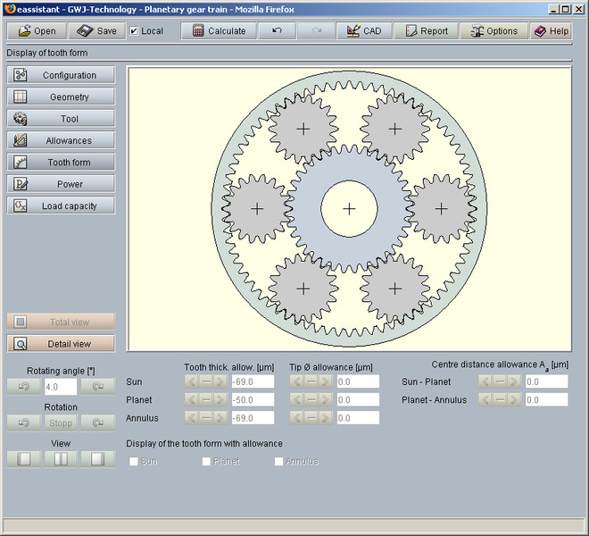 Un point fort du module est la représentation de la forme de dent exacte avec animation/simulation de l'engrènement des dents des soleil/planétes et des planétes/couronnes. Pour cette représentation, les petites, moyennes et grandes dimensions peuvent être sélectionnées pour l'épaisseur de la dent et l'entraxe. En outre, l'utilisateur recoit les conseils ou les avertissements appropriées par exemple pour les éventuelles erreurs d'engrénement.