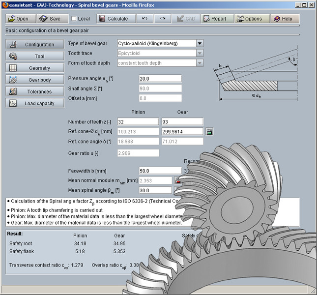 Le calcul du rapport de conduite apparent, du rapport de recouvrement et du rapport total de conduite s'effectue selon la norme ISO 23509 à l'aide de la denture similaire. De plus, le calcul de l'ébauche est effectué avec les longueurs du cône et les angles de spirale. Pour compléter cela, des mesures du disque de roue supplémentaires, distance de la tête de référence et distance de référence incluses, sont calculées. La distance de référence peut, en plus, être entrée individuellement.