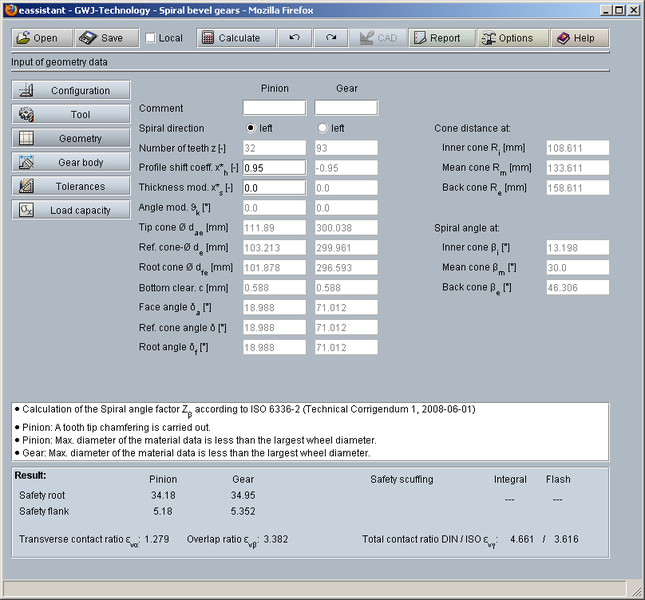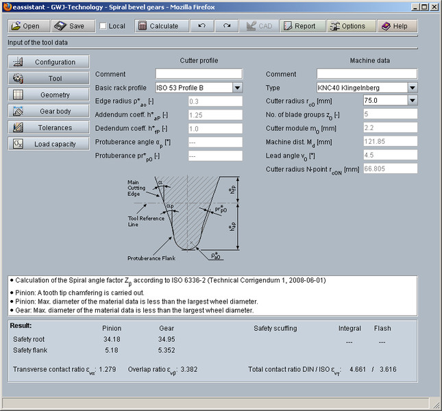 En plus du calcul de la géométrie, le calcul de la résistance est également disponible selon la norme ISO 10300 Méthode B1. La sécurité pour la résistance à la fatigue ainsi que la sécurité statique peuvent être calculées. Il s'agit du calcul de la résistance du pied de la dent et des flancs, en particulier la résistance à la corrosion. Une base de données de matériaux et de lubrifiants reste à disposition lors du calcul de la résistance. De plus, le type de travail, c'est-à-dire un travail amplifié, variable ou avec des approches successives peut aussi être pris en compte dans le calcul.