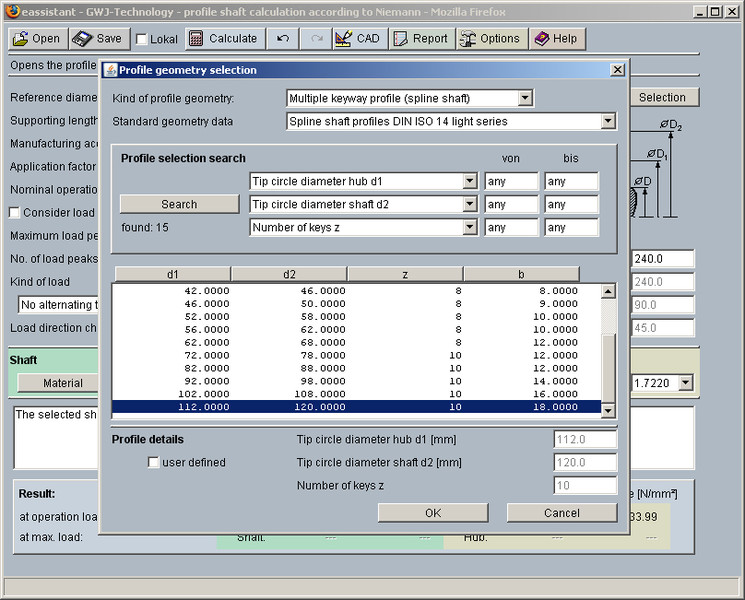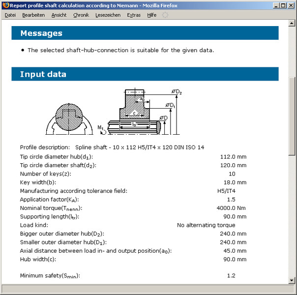 Pour les liaisons de cannelures à flancs parallèles selon les normes DIN ISO 14 (séries légére et moyenne), DIN 5464, DIN 5471 et DIN 5472 le calcul de capacité de charge peut s'effectuer selon Niemann „Maschinenelemente“ Tome 1, Edition 2001. Les dimensions peuvent être facilement sélectionnées à partir de la base de données ou peuvent être rapidement identifiées via la fonction de recherche d'un profil. En outre, des profils différents peuvent être entrés pour le calcul selon la norme.