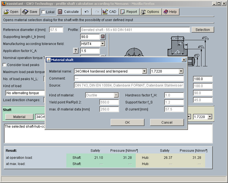 Les pressions autorisées sont déterminées en fonction des propriétés des matériaux. Les matériaux existants peuvent être sélectionnés facilement à partir de la base de données des matériaux intégrée dans le module. De plus, les matériaux pour le calcul peuvent être saisis individuellement. Pour les différentes charges d'entrée et les rendements, le facteur de répartition de charge sera calculé par analogie sur la base des caractéritiques géométriques de l'utilisateur selon la norme DIN 6892. Le nombre de charges maximales et la nature du moment du couple alternatif existant peuvent être spécifiés pour le calcul.