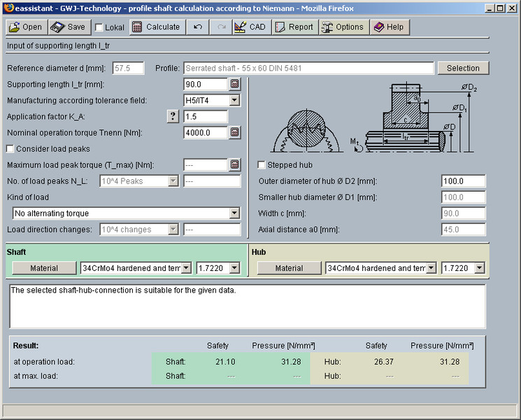 Dans la liste des résultats, les sécurités et les pressions de la charge d'exploitation et de la charge maximale pour arbre et moyeu sont clairement affichées en cours de frappe. A la fin du calcul, l'utilisateur recoit pour information un protocole de calcul. Ce dernier contient les détails de la méthode de calcul, les données d'entrée et les résultats détaillés et compréhensibles. Il est disponible aux formats HTML et PDF.
