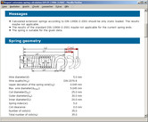 La réalisation du calcul est possible pour une sollicitation dynamique ou statique/quasi-statique. Les matériaux des ressorts peuvent être facilement choisis à partir de la base de données ou bien peuvent être saisis manuellement. Le calcul avec des matériaux spécifiques est ainsi possible. Pour les matériaux de ressort laminés à chaud, un écart d'enroulement peut également être défini. De plus, les tolérances pour le diamètre du fil selon les normes DIN 2076 (B et C) et DIN 2077 peuvent être définies ou bien saisies individuellement. Selon le procédé de fabrication des matériaux choisis, c-à-d. laminé à chaud ou façonné à froid, le calcul des tolérances s'effectue selon les normes DIN 2096 ou DIN 2097. Le calcul s'effectue selon la fréquence caractéristique du ressort. La température de travail peut également être prise en compte lors du calcul.