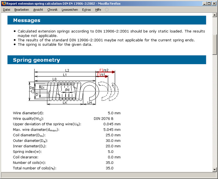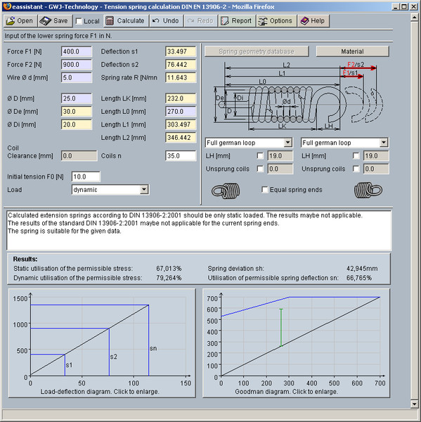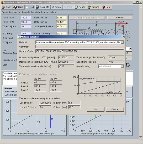 Les principaux résultats, à savoir l'utilisation statique et dynamique de la tension autorisée, le débattement du ressort et l'utilisation des courses élatiques admises sont déjà clairement affichés lors de la frappe. De plus, il y a la possibilité d'obtenir les diagrammes de Goodman et de force-course, qui peuvent être agrandis en cliquant dessus.