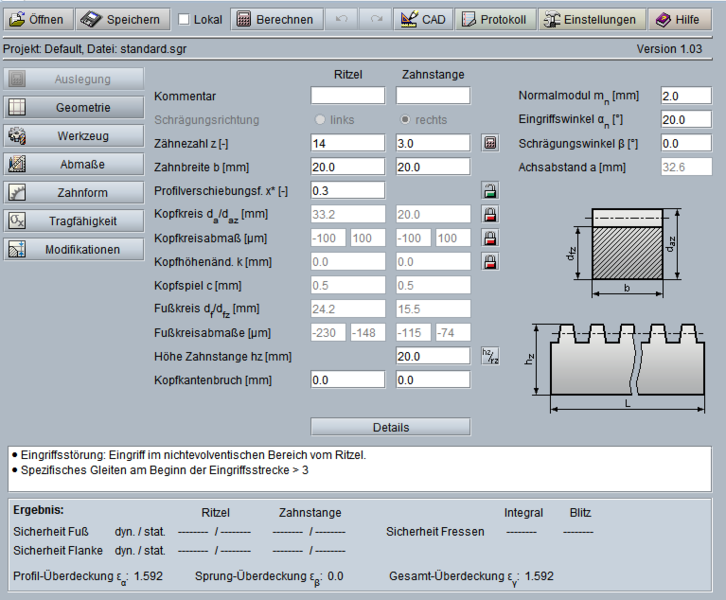 In addition to geometry, allowances and gear tooth form, the load capacity according to DIN 3990 and ISO 6336 including load spectra can be easily calculated. For 2D CAD systems, the standard format DXF is available.