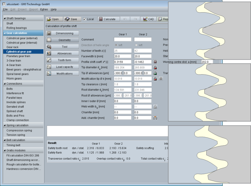 In addition to various dimensioning functionalities for the distribution of the profile shift, a new function for disconnecting the centre distance from the profile shift was added. By using the function "Fixed working centre distance (recalculation)", the profile shift coefficients can be defined independently from the centre distance. This enables, for example, the calculation of existing gear pairs that are to be installed in the housing with the "wrong" centre distance. Transverse contact ratio, backlash and load capacity are also calculated correctly in this case. This function can also be used for the calculation of small-module gears.