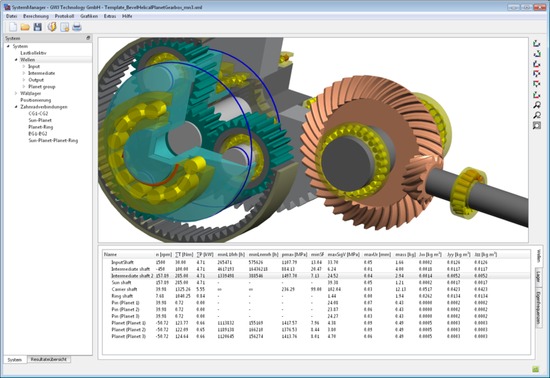The option "Add System" is added to the context menu for groups in the system tree. It allows to generate a multi-stage cylindrical gearbox or a simple planetary gear set. With just a few specification, for the multi-stage cylindrical gearbox for example the number of stages, the total ratio, the input torque and the input speed, a proposal for a multi-stage gearbox can be created with a simple mouse click. Shaft diameter and dimensions of the cylindrical gears are suggested for each stage and automatically set up as a system. The shaft geometries can be refined afterwards and the bearings for example can be changed into rolling bearings. The software makes it easy to get a first draft of a multi-stage cylindrical gearbox. It works for simple planetary gear trains in a similar way. This also saves time when building the system.