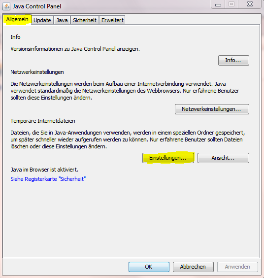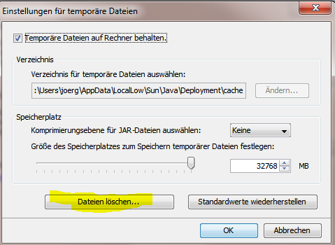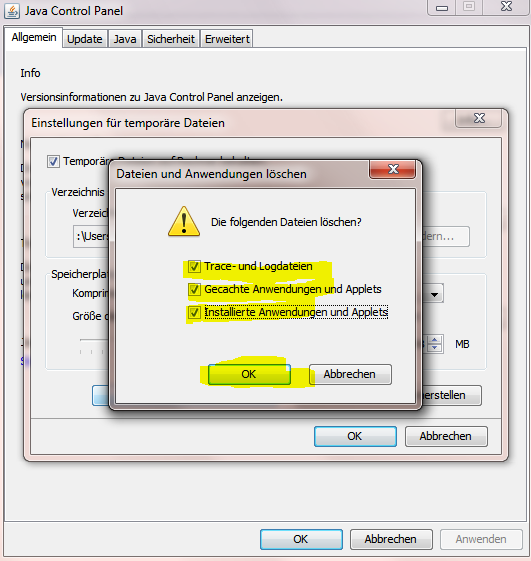 In the Java Control Panel, under the "General" tab, click "Settings" under the "Temporary Internet Files" section. The "Temporary Files Settings" dialog box appears. Click "Delete Files" on the "Temporary Files Settings" dialog. The "Delete Files and Applications" dialog box appears. Activate all options and click "OK". This deletes all old files from the cache.