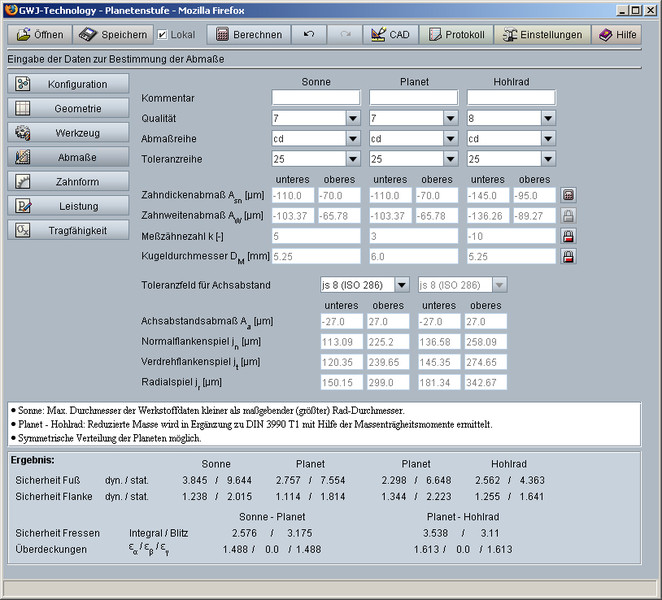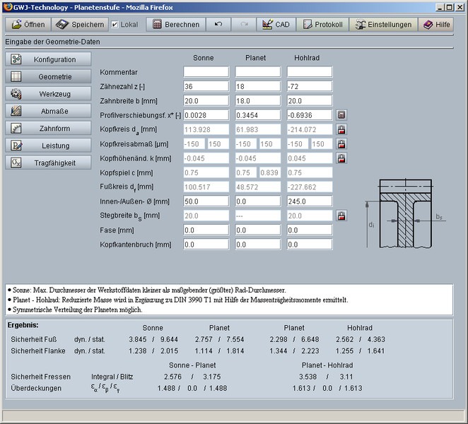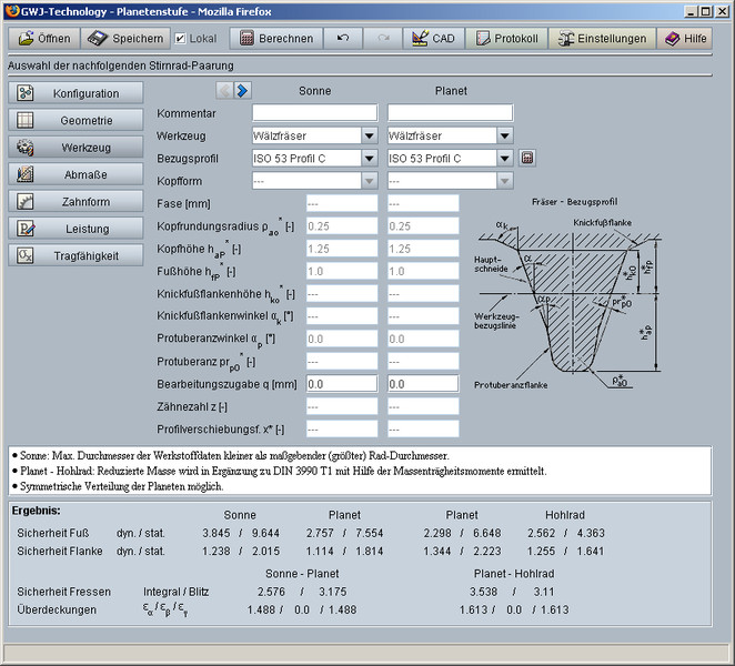 Określanie geometrii walcowych kół zębatych odbywa się zgodnie z normami DIN 3960, DIN 3961, DIN 3964, DIN 3967, DIN 3977 i DIN 868. W obliczeniach uwzględniane jest: przesunięcie zarysu, fazowanie i tolerancje. Wartości określające wielkość i kształt zębów (odległość osi, grubość zębów) są automatycznie proponowane przez program lub można je manualnie zdefiniować. Przy określaniu przesunięcia zarysu istnieje również możliwość jego interpretacji dla zrównoważonych, specyficznych poślizgów. Można także określić tolerancję grubości zębów oraz odległości osi z możliwością wyboru z listy lub indywidualnego zdefiniowania. Ponadto użytkownicy mają do dyspozycji bazę danych, umożliwiającą wybór wyjściowego profilu narzędzia według norm: ISO 53, DIN 867 i DIN 3972.